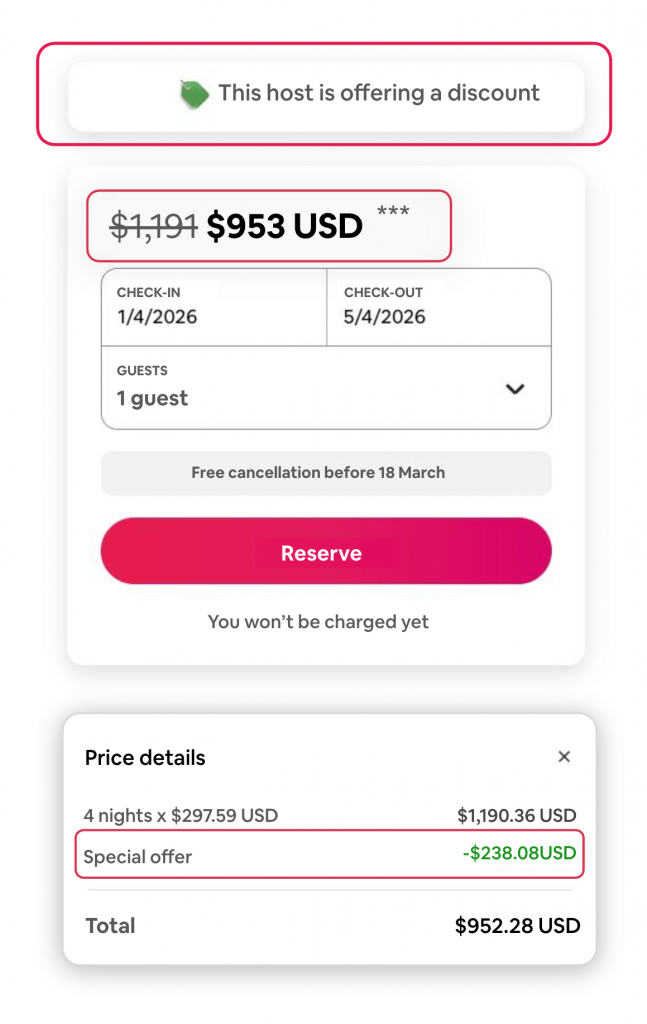 Используя эти Скидки Airbnb эффективно, вы можете не только значительно Оптимизируйте свои позиции в поисковой выдаче. и стать более конкурентоспособными стратегии ценообразованияа также получить возможность быть представленным в многомиллионных маркетинговых кампаниях Airbnb.
