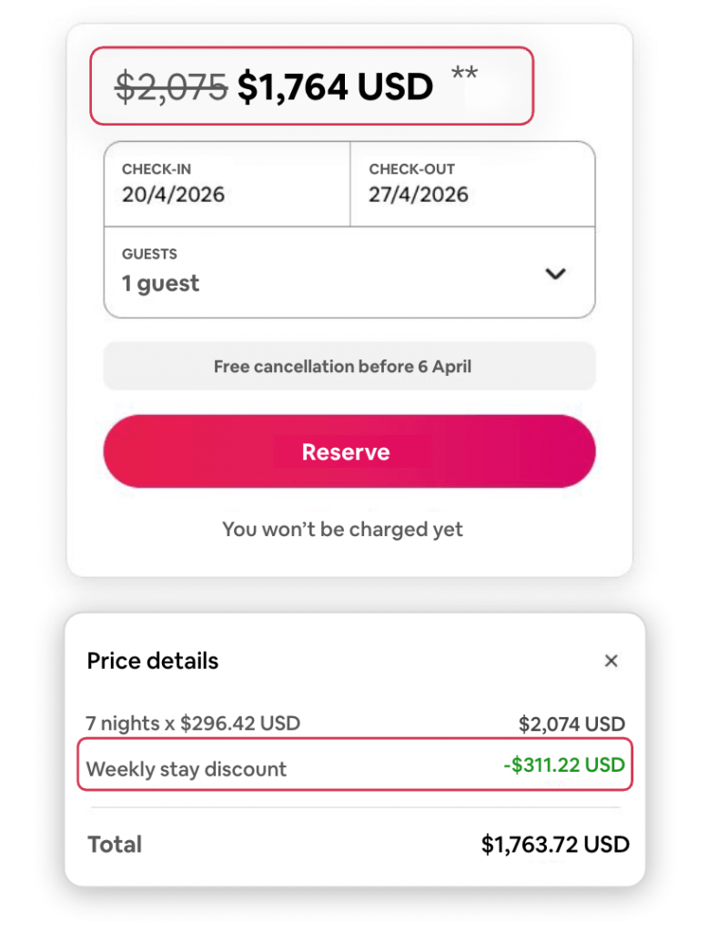 Эта скидка распространяется на все полученные бронирования. Поэтому, если гость бронирует проживание на длительный срок, ваш доход может значительно снизиться. Кроме того, вам придется долго ждать потенциального отзыва, и вы потеряете свои возможности по ведению переговоров о краткосрочных мероприятиях.