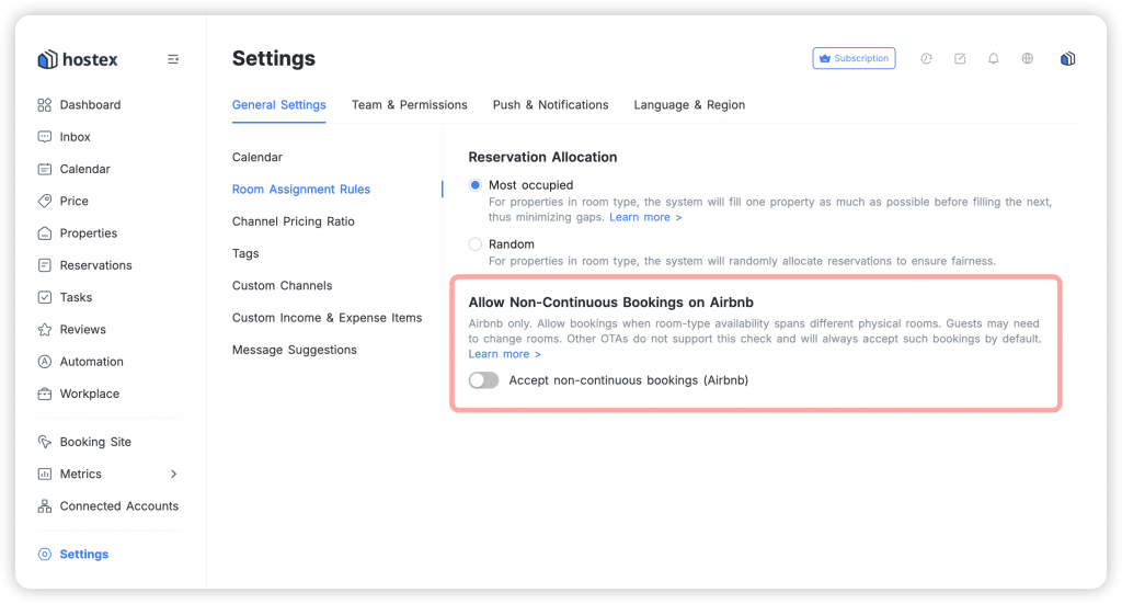 启用此功能后,即使房源分布在不同的房产中,系统也会接受 Airbnb 连续晚的预订: