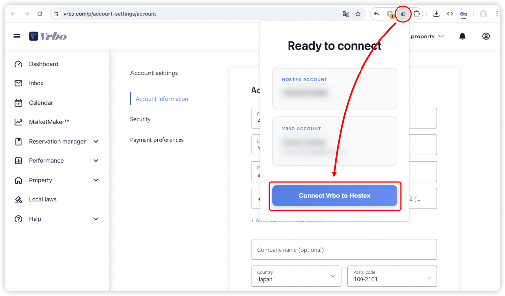 步骤 4:使用扩展程序将 Vrbo 连接到 Hostex