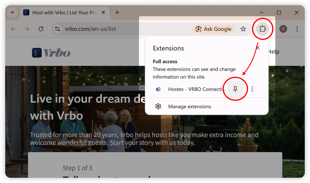 - 点击 Hostex – Vrbo 连接扩展图标 在 Chrome 工具栏中
