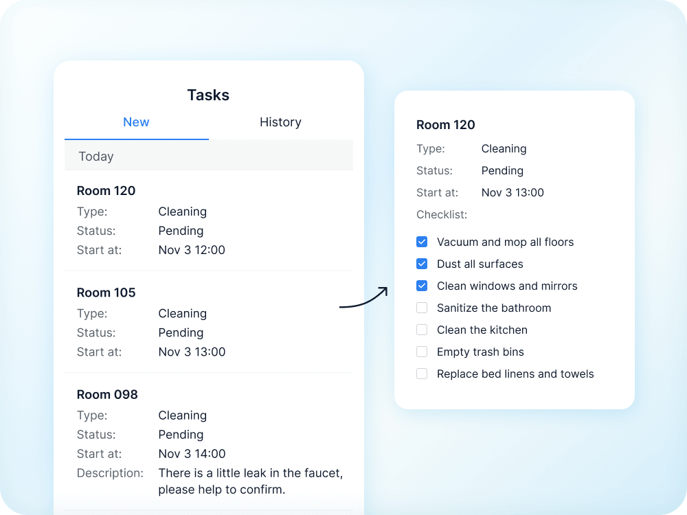 Tasks for cleaning and maintenance are automatically generated with detailed checklists based on booking events such as guest arrival or departure.